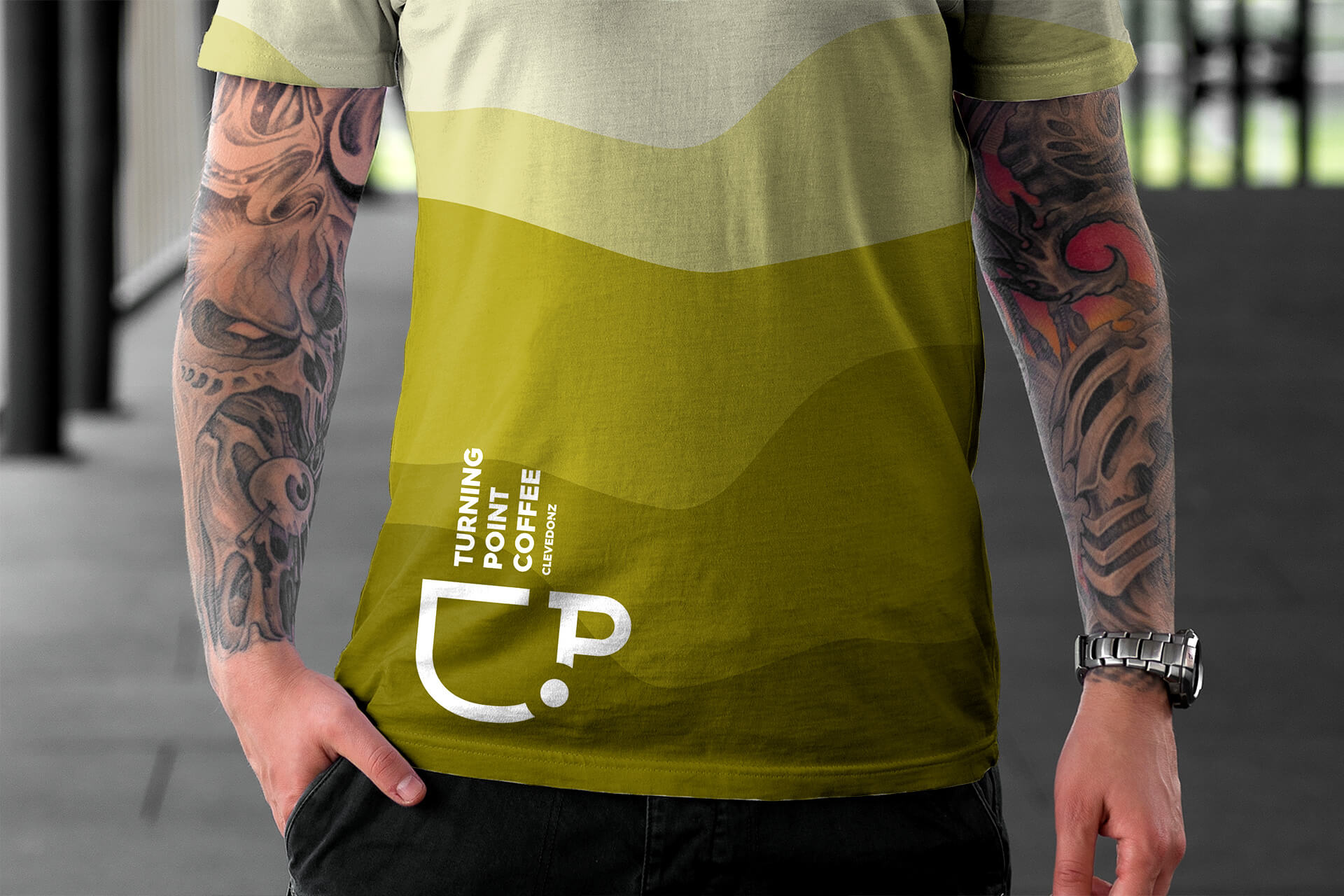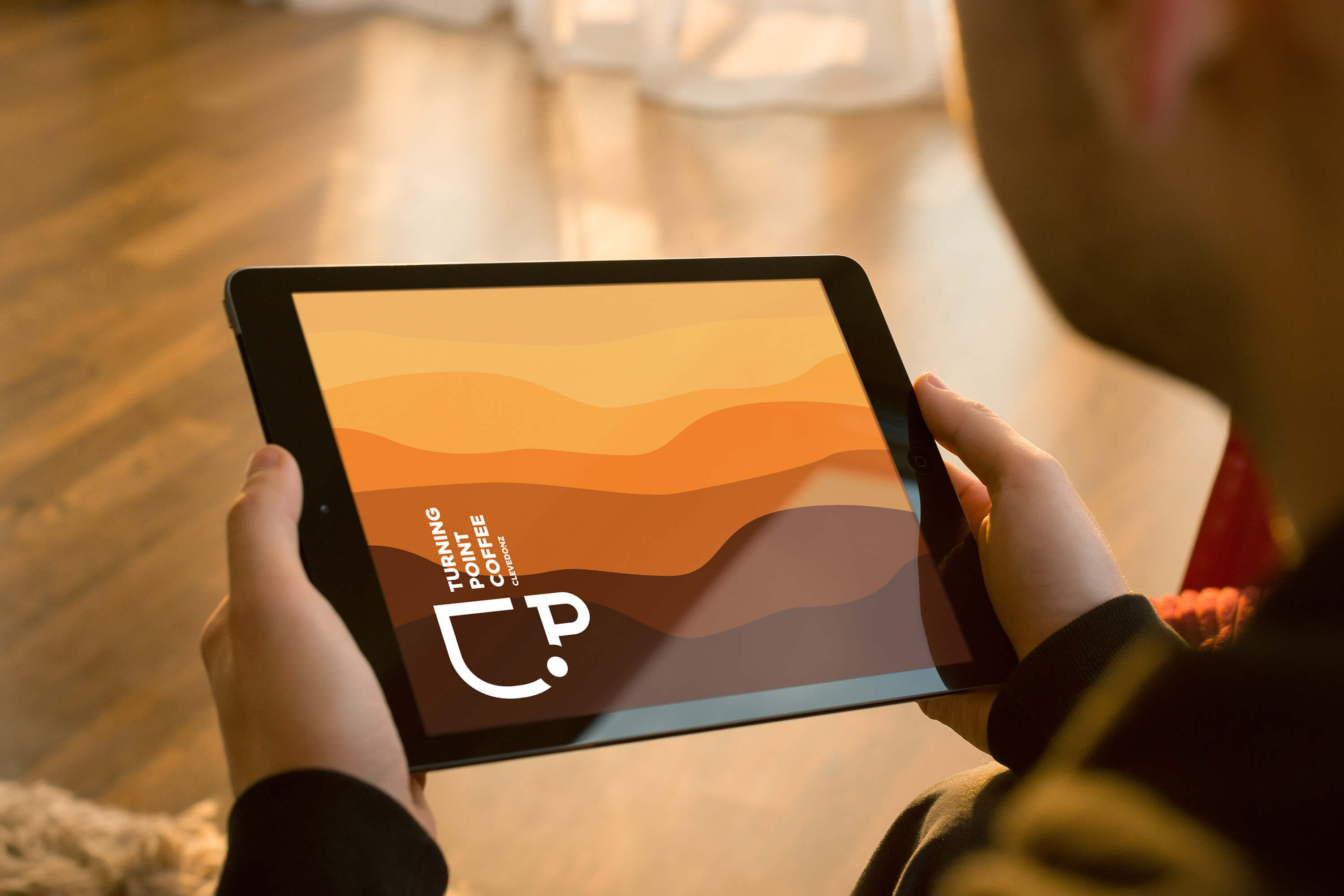 The design concept for the coffee brand came from several mixed elements. Firstly, the term 'turning point' refers to a point in the coffee production process but also was indicator for change - 'brewing change'. Secondly, Stu and his partner Gemma lived overlooking beautiful countryside, with rolling hills that changed appearance throughout the day. We aimed to connect these important elements to the layered effects of pouring good coffees and the remnants of froth, milk and drink left after drinking one.